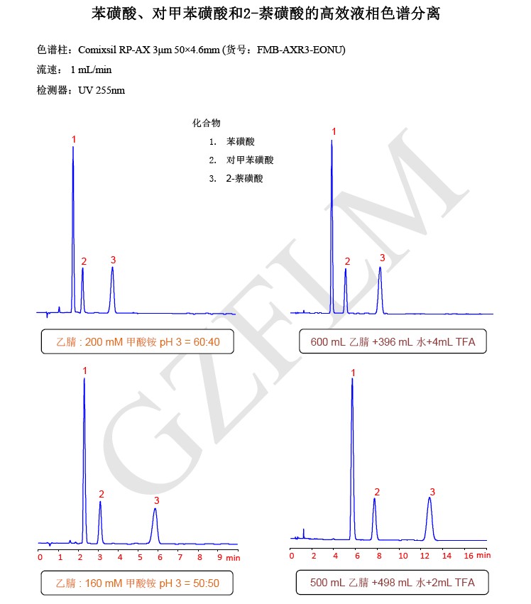 從上圖能看出,當(dāng)流動(dòng)相加入的緩沖鹽的濃度越大或者加入酸的濃度越大時(shí),會(huì)增加Comix柱子的洗脫能力。