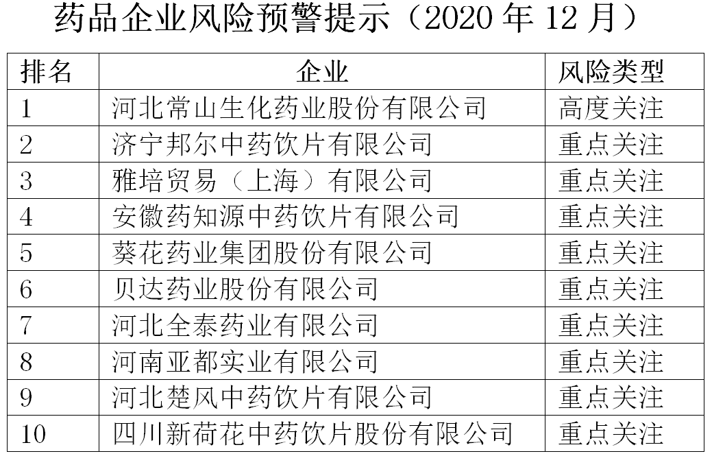 近日,中國(guó)健康傳媒集團(tuán)輿情監(jiān)測(cè)中心發(fā)布藥品企業(yè)風(fēng)險(xiǎn)預(yù)警提示(2020年12月),公開(kāi)風(fēng)險(xiǎn)指數(shù)排名前十的企業(yè)。河北常山生化藥業(yè)股份有限公司(以下簡(jiǎn)稱常山藥業(yè))排名第一,為“高度關(guān)注企業(yè)”;濟(jì)寧邦爾中藥飲片有限公司、雅培貿(mào)易(上海)有限公司、安徽藥知源中藥飲片有限公司、葵花藥業(yè)集團(tuán)股份有限公司、貝達(dá)藥業(yè)股份有限公司、河北全泰藥業(yè)有限公司、河南亞都實(shí)業(yè)有限公司、河北楚風(fēng)中藥飲片有限公司、四川新荷花中藥飲片股份有限公司分列第2至10位,為“重點(diǎn)關(guān)注企業(yè)”。